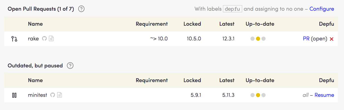 Of course you can also handle pausing by adding version constraints to your Gemfile or package.json. But if you have Depfu configured to send you PRs for out-of-spec updates, we would send you updates anyway, so the pause commands are especially useful in this scenario.