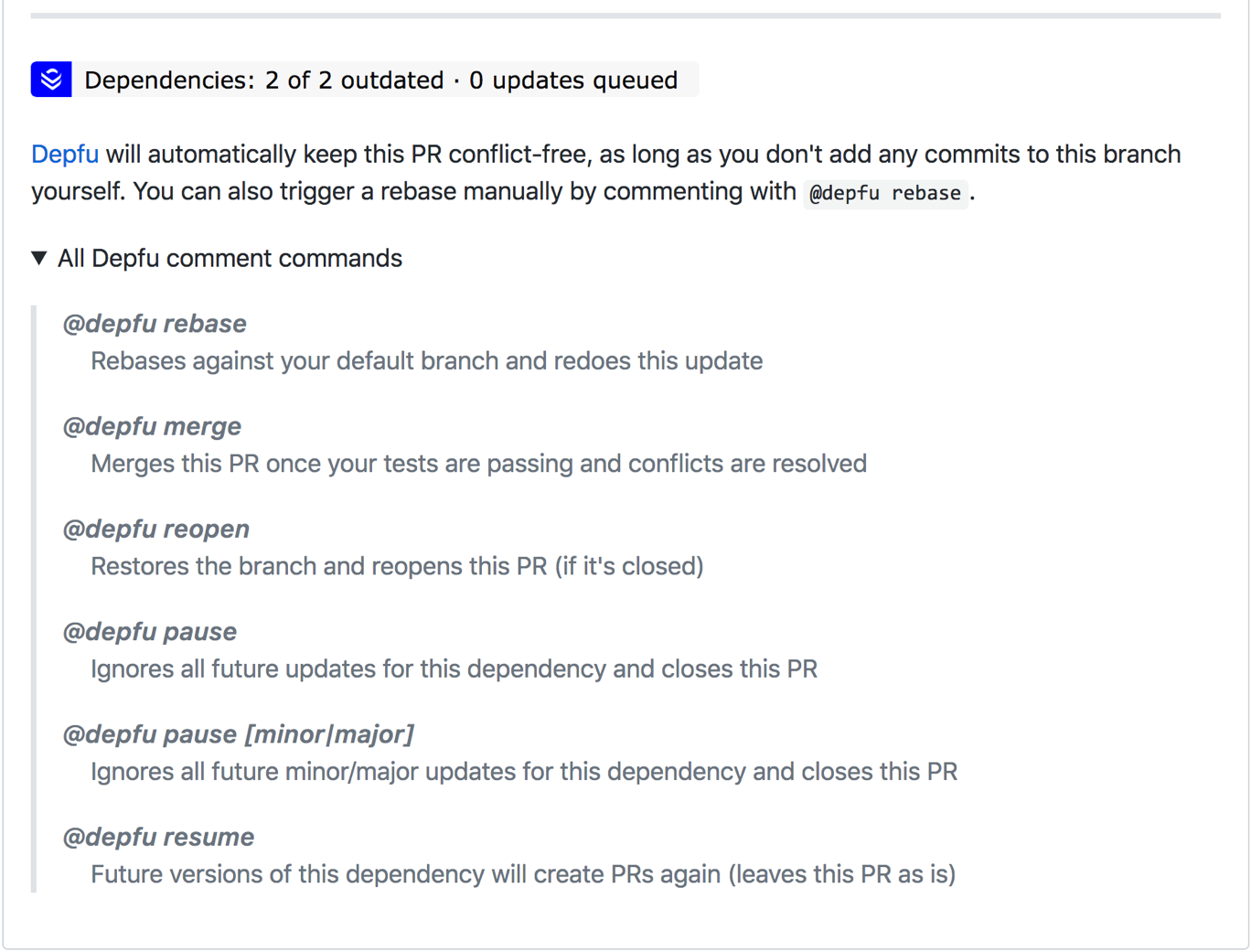 Today we’re launching a few more bot commands that we think will make your everyday work with Depfu smoother and easier: