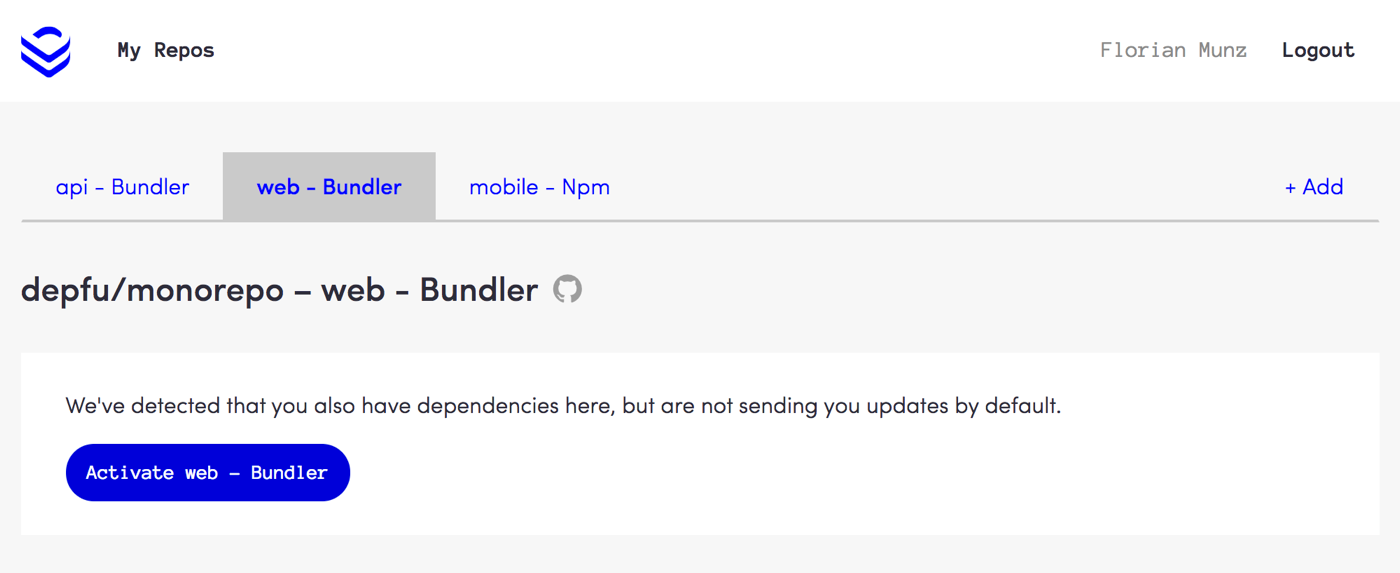 By default, we only activate the first of these projects/folders we find and start sending you pull requests. The other projects you’ll have to activate yourself in the Depfu UI. This is to make sure it’s a folder you actually want to get dependency updates for and not just random test files.