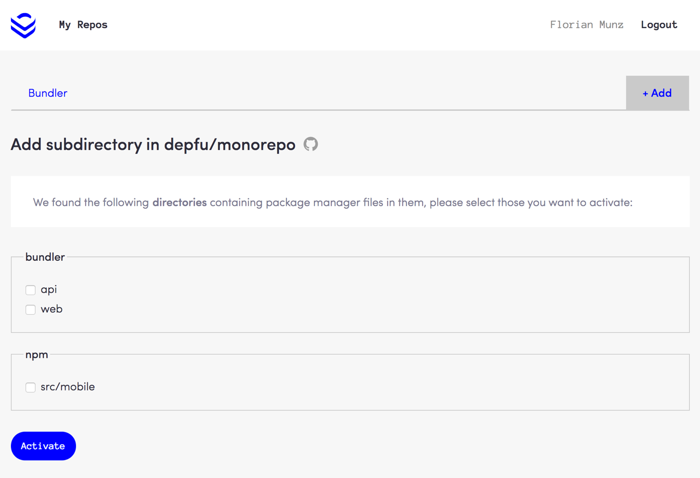If you’re creating new folders in your monorepo or have an existing repo where we didn’t do the auto-detection, you can add a folder yourself. Just click the “+ Add” button and select the folders you want to enable in Depfu.