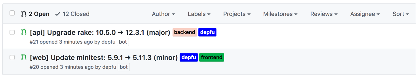 • Indicate the folder in the PR title: To also visually differentiate the PRs from each other when you look at your list of PRs, we prefix them with the name of the folder. You can additionally configure Depfu to use a unique label for each project.