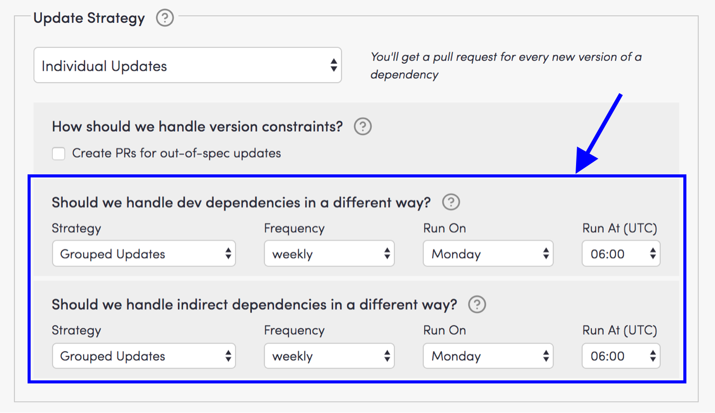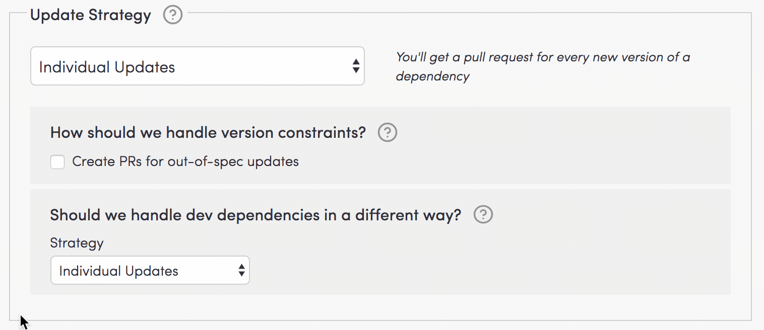 We think of these as strategies you can use to reduce the amount of PRs you get from Depfu. By default we will continue to send individual PRs, but depending on how you structure and treat your dependencies, we think it makes sense to give you the option to update certain types of dependencies together.