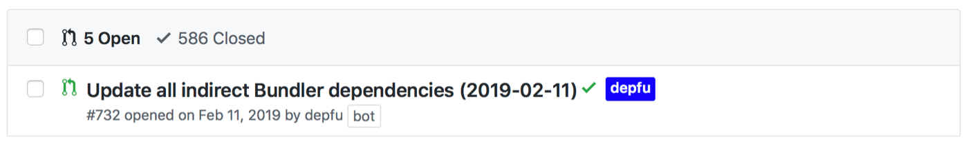 Our strategy for handling indirect dependencies with Bundler so far has been to not update them by default. They still get updates together with their direct dependencies, since that is Bundler’s default. This usually works out fine from our experience, but it results in bundle outdated showing you there are gems that need updating, even if you have applied everything from Depfu.