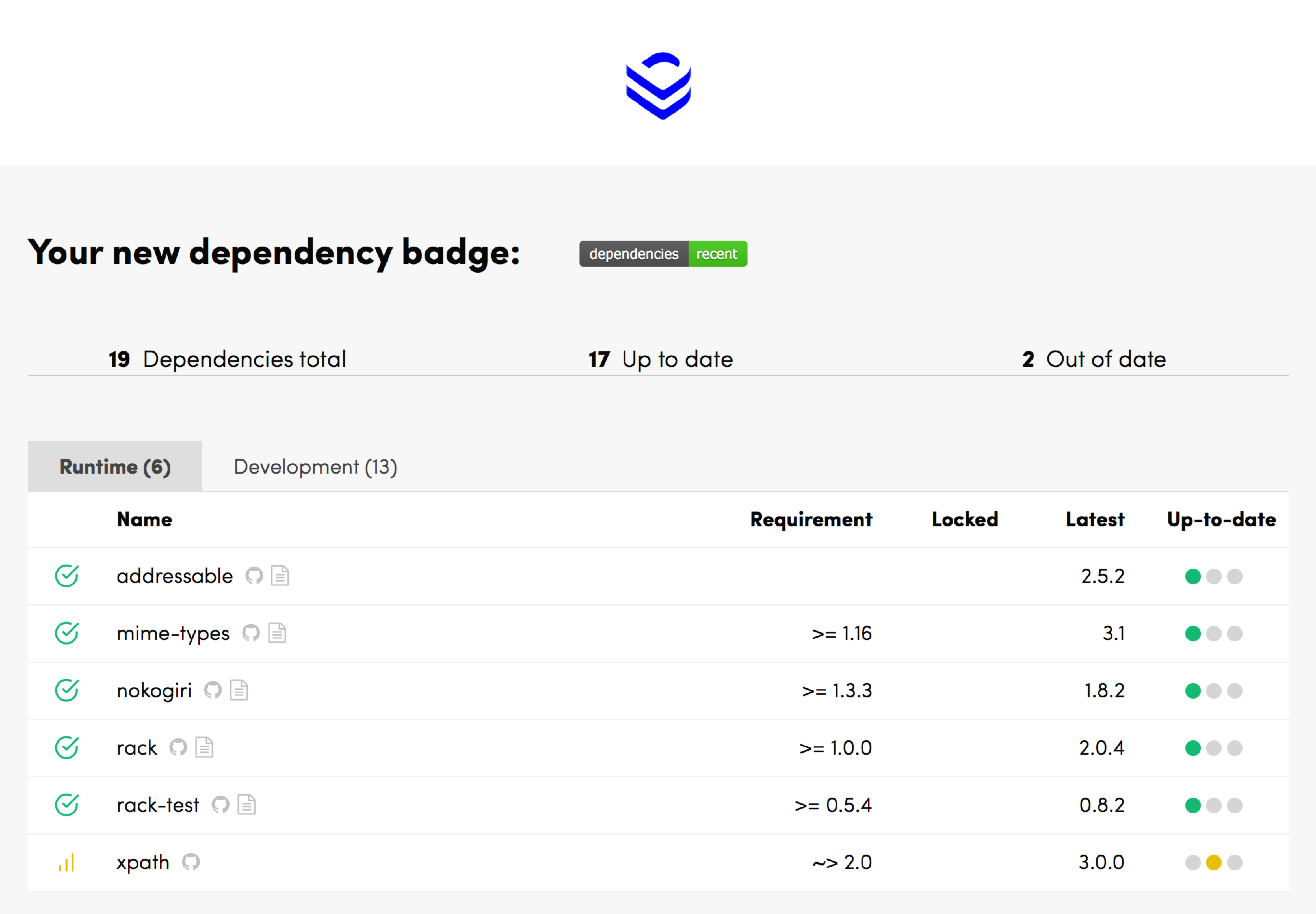In the wake of the Gemnasium shutdown announcement a few of our users asked us to offer badges showing the state of dependencies of their repos. I wasn’t really excited about it and realized I was never a big fan of the dependencies badge, because it always looks like this:
