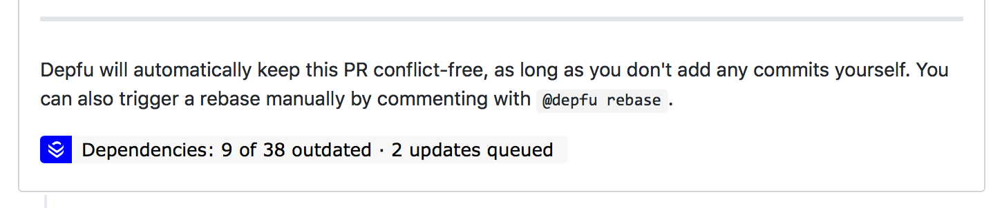 The new dashboard is meant as an additional source of information, not your primary way to use Depfu. We still believe in doing as much as possible via pull requests and don’t require you to use our app at all. Which is why we’ve also started to add a small badge to the pull requests, giving you high-level stats about your repo.
