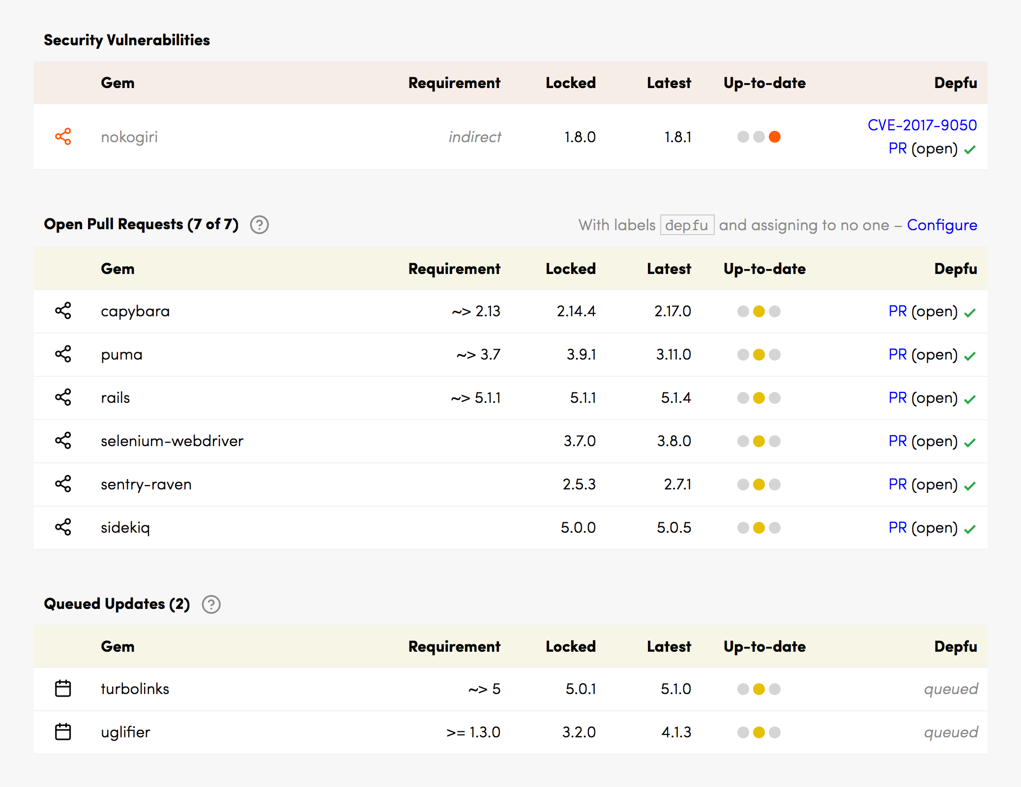 The dashboard’s primary focus is listing outdated dependencies grouped by their status in Depfu. It allows you to quickly see queued updates, outdated gems with a version spec and if there are any conflicts we couldn’t resolve.